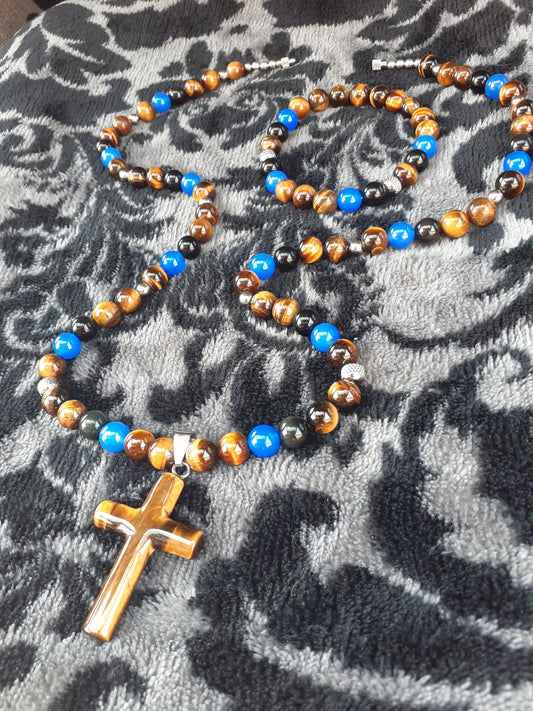 Tiger Eye Cross Blue Agsidian Necklace Set 12 Inch