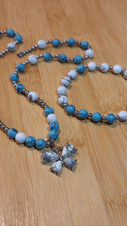 Howlite Butterfly Turquoise 2Pc Set With Matching Stretch Bracelet