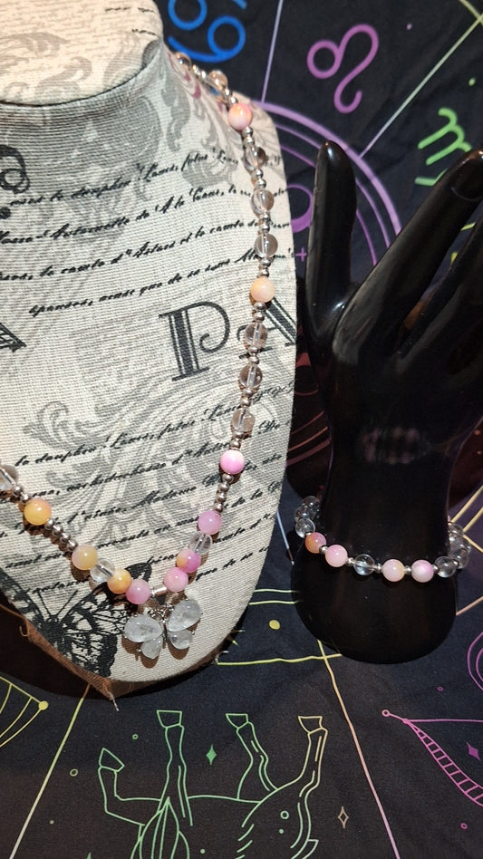 Quartz Butterfly Pink Jade 2pc Set With Matching Stretch Bracelet